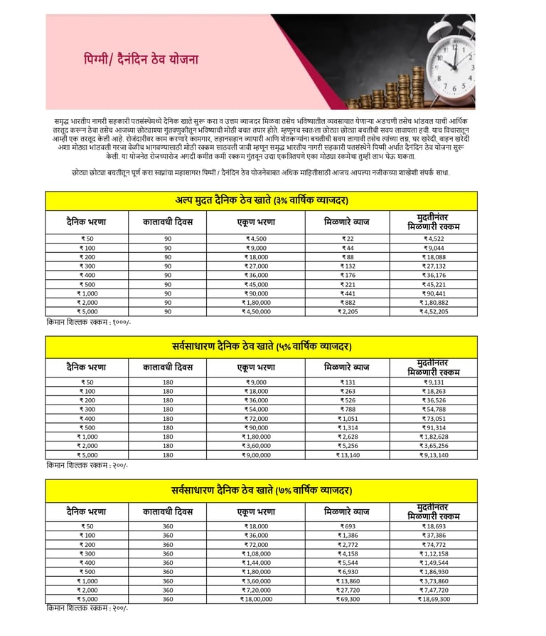 समृद्ध भारतीय नागरी सहकारी पतसंस्थेमध्ये दैनिक खाते सुरू करा व उत्तम व्याजदर मिळवा तसेच भविष्यातील व्यवसायात येणाऱ्या अडचणी तसेच भांडवल याची आर्थिक तरतूद करून ठेवा तसेच आजच्या छोट्याश्या गुंतवणुकीतून भविष्याची मोठी बचत तयार होते. म्हणूनच स्वतःला छोट्या छोट्या बचतीची सवय लावायला हवी. याच विचारातून आम्ही एक तरतूद केली आहे. रोजंदारीवर काम करणारे कामगार, लहानसहान व्यापारी आणि शेतकऱ्यांना बचतीची सवय लागावी तसेच त्यांच्या लग्न, घर खरेदी, वाहन खरेदी अशा मोठ्या भांडवली गरजा वेळीच भागवण्यासाठी मोठी रक्कम साठवली जावी म्हणून समृद्ध भारतीय नागरी सहकारी पतसंस्थेने पिग्मी अर्थात दैनंदिन ठेव योजना सुरू केली. या योजनेत रोजच्यारोज अगदी कमीत कमी रक्कम गुंतवून उद्या एकत्रितपणे एका मोठ्या रकमेचा तुम्ही लाभ घेऊ शकता.
